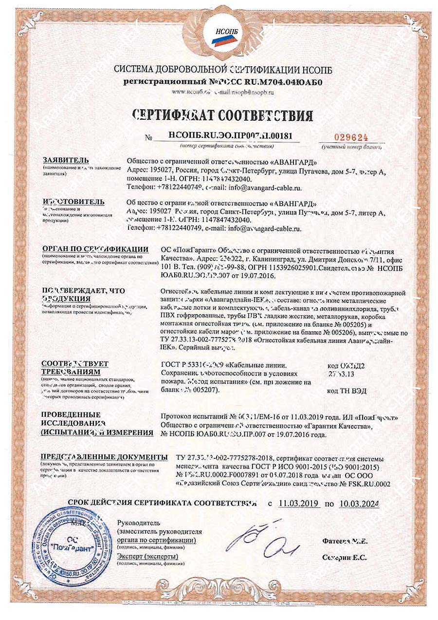 и огнестойкий кабель КПСнг(А)-FRLS, КПСЭнг(А)-FRLS, КПСнг(А)-FRHF, КПСЭнг(А)-FRHF, КПКВнг(А)-FRLS, КПКЭВнг(А)-FRLS, ВВГнг(А)-FRLS, ВВГЭнг(А)-FRLS, ВВГнг(А)-FRLSLTx, ВВГЭнг(А)-FRLSLTx, ППГнг(А)-FRHF, ППГЭнг(А)-FRHF производства «Авангард».