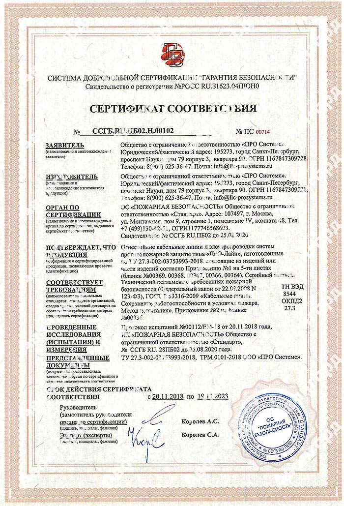 Огнестойкий кабель «Авангард» включен в состав и сертифицирован в огнестойких кабельных линиях «ПРО-Лайн», производства компании ООО «ПРО Системс».