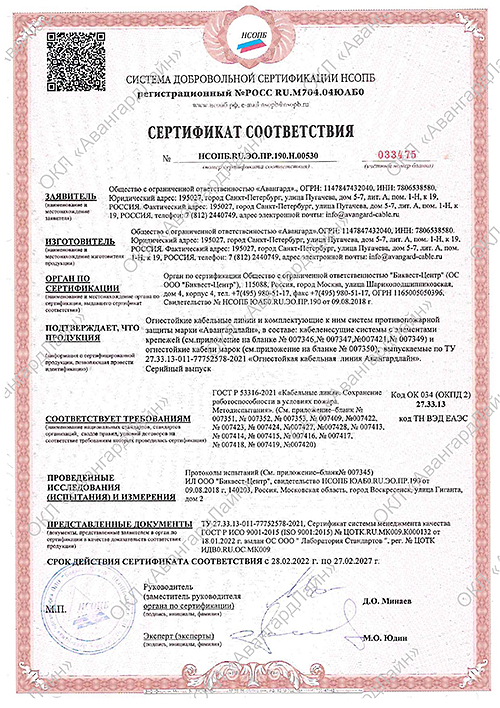 ОБРАЗЕЦ СЕРТИФИКАТАОГНЕСТОЙКОЙ КАБЕЛЬНОЙ ЛИНИИСертификат ОКЛ предоставляется исключительно на системное решение, которое включает набор марок огнестойкого кабеля и соответствующий тип кабеленесущей системы, металлического крепежа, указанные в сертификате ОКЛ. Монтаж огнестойкой кабельной линии должен проводиться квалифицированными специалистами в соответствии с инструкцией по монтажу ОКЛ, правилами технической эксплуатации электроуста- новок потребителей (ПУЭ) и другой нормативной документацией производителей кабеля и кабеленесущих систем. ООО «Авангард» гарантирует сохранение работоспособности сертифицированной ОКЛ в условиях пожара только при условии соблюдения всех указаний Инструкции по проектированию и монтажу. | ![]() |